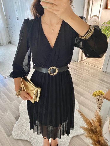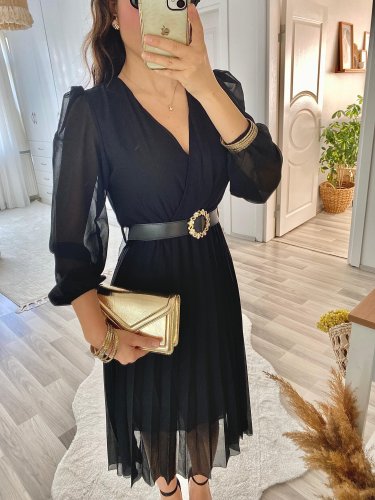 • Kadın şifon kumaş astalı kloş kesim kruvaze yaka midi boy elbise